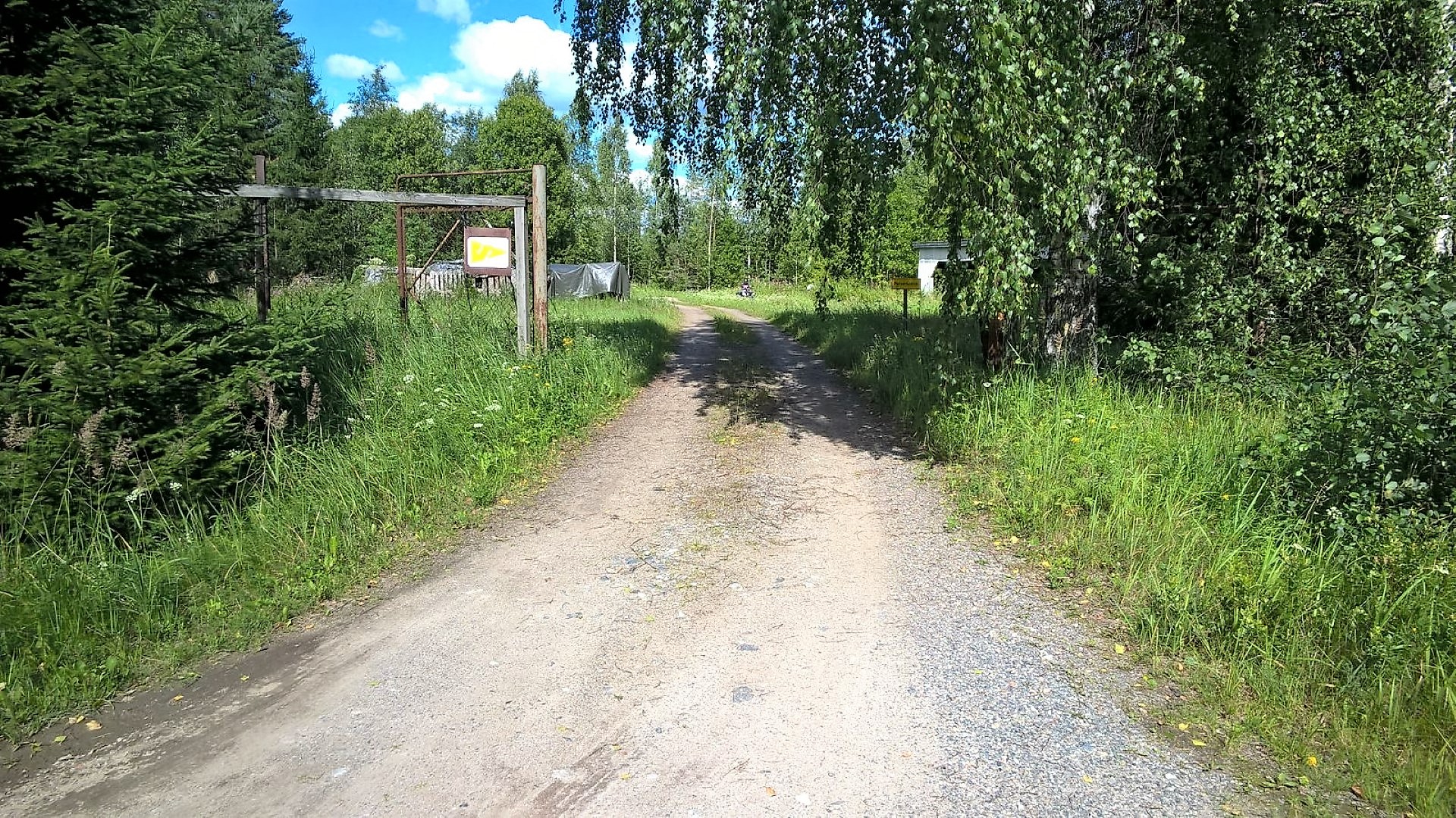 Kaivokselle kääntyvä tie on merkattu pelastustieksi sekä portin vasemmalla puolella on luolanuolimerkintä. (Kuva otettu 19.7.2016).